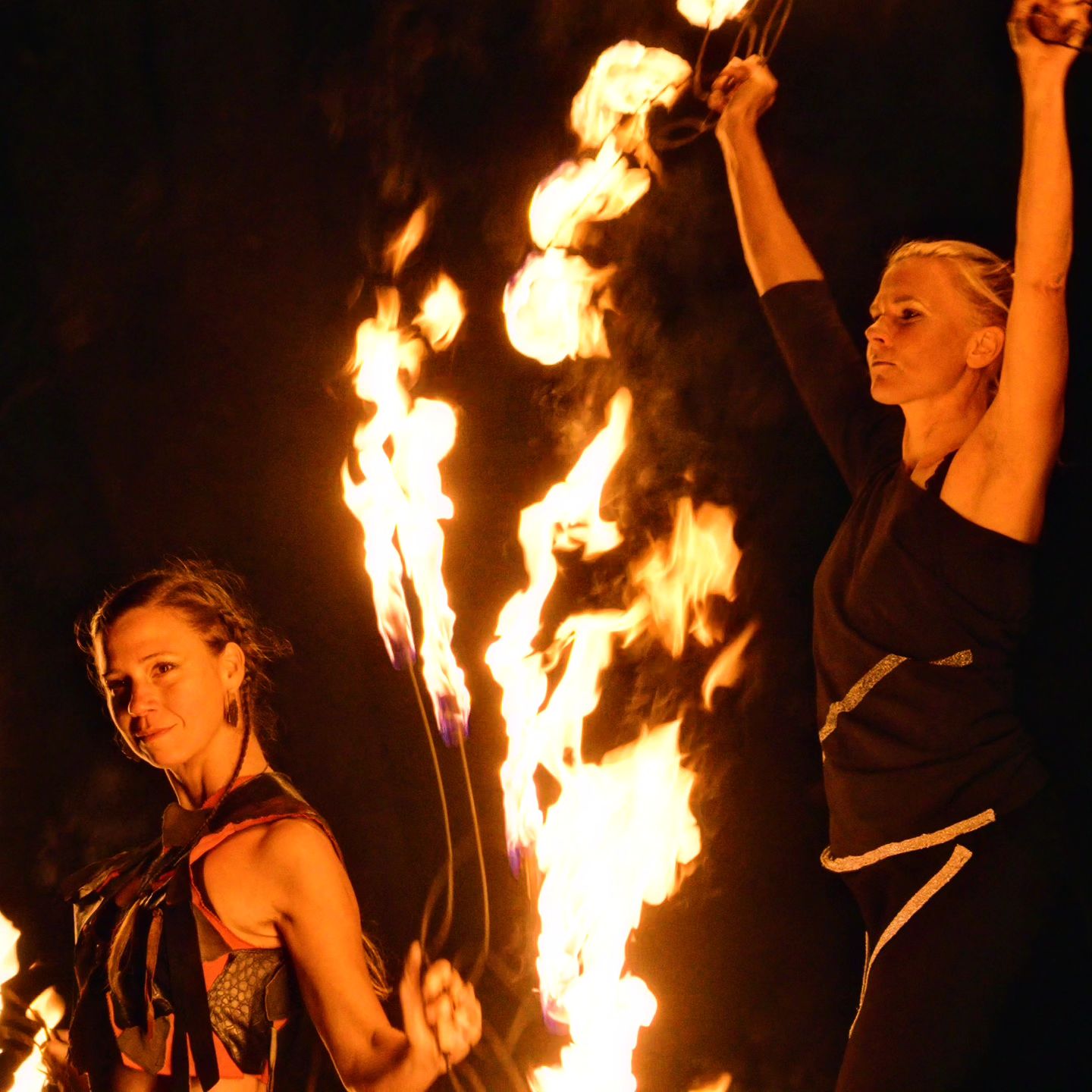 Večerní vystoupení, při kterých se zpomaluje dech a zrak se nechce odtrhnout od plamenů. Oheň ovládáme v mnoha podobách hořící tyče, poi, vějíře, pyro efekty i prvky akrobacie.